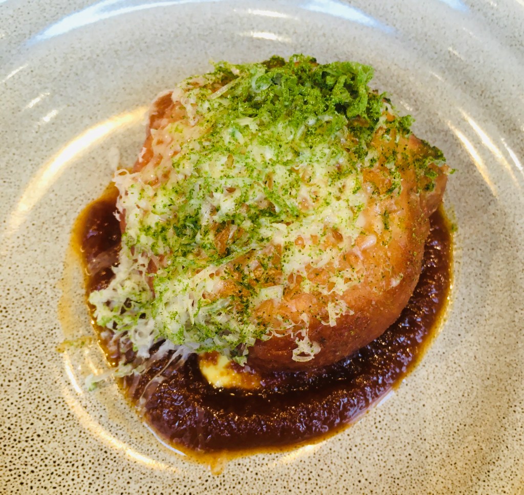 To start a crispy fried doughnut stuffed with mushroom pate and covered in Swiss cheese was presented to me. It didn’t last long but wow what a taste explosion. I was excited to see what came after.