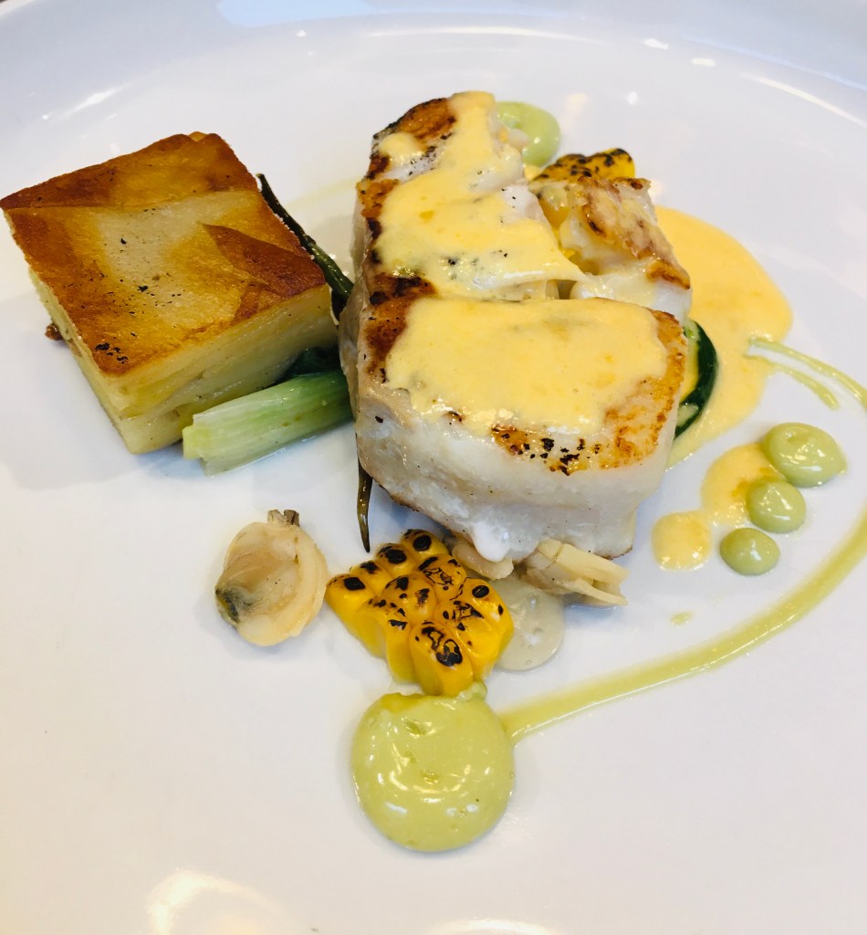 Then came Clam and Coley Chowder for us both. Here I had chosen to swap a course out which they did for me without hesitation. I had expected soup but that is not what was brought out. A piece of fish with a potato terrine, roasted corn and a lemon gel was presented and dutifully scoffed down.