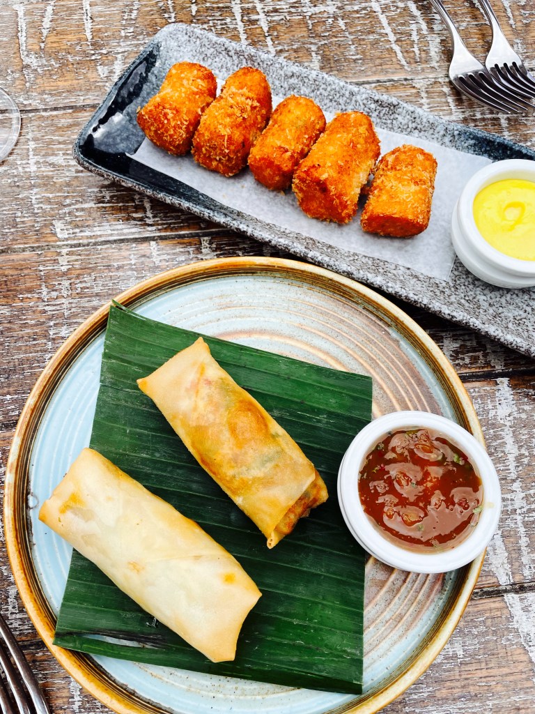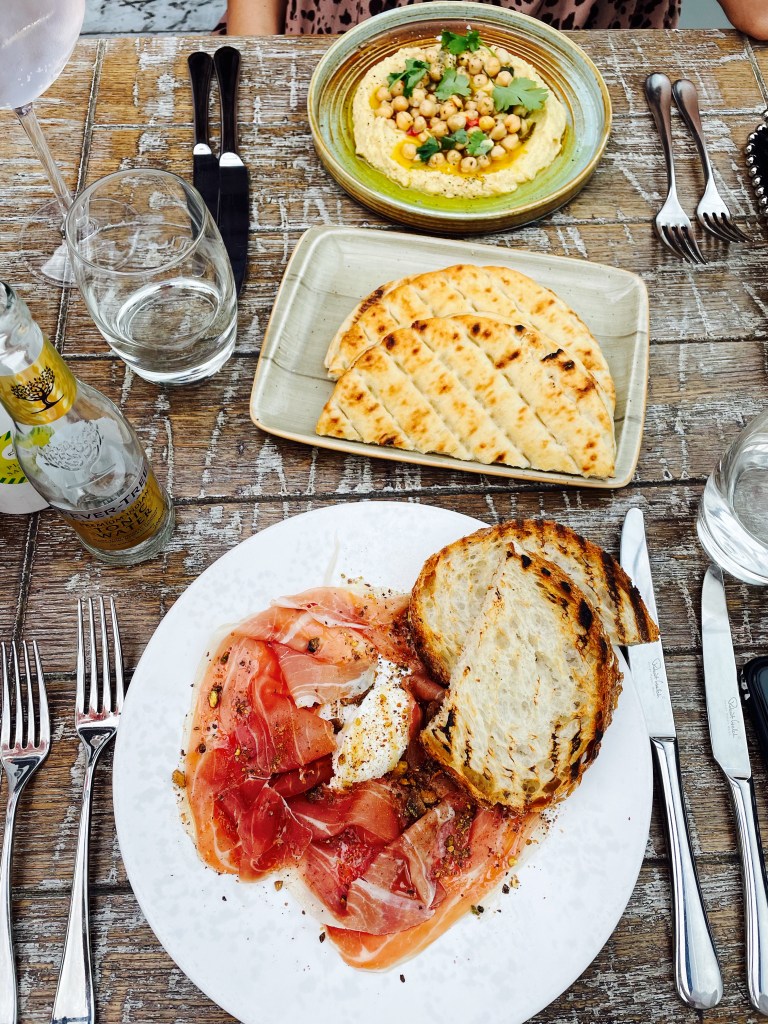 We were taken upstairs to the terrace where unfortunately it had gotten a little cloudy. But after a few hours in the heat already it was actually a nice relief, with a slight breeze coming through the sidings. We were that table that takes forever to order drinks, so by the time we were ready we ordered our drinks and food all at once. The menu was pretty extensive so it was quite hard to narrow it down, especially when you’re as greedy as me. For starters I chose Crispy duck spring rolls. My friends chose Hummus with pita bread, Ham with buffalo ricotta and Sweet potato and chorizo croquettes. We all enjoyed our starters. My spring rolls were crispy and packed with duck and the hummus portion was enormous.