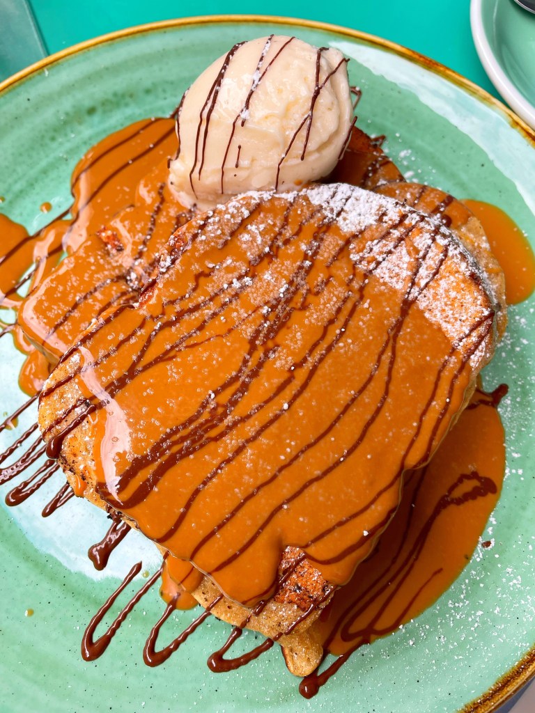 As it was a beautiful day my sister and I grabbed a table on the small outdoor section on the rows and ordered drinks whilst looking through the rather large menu. We decided to treat ourselves. She ordered Blueberry pancakes with a berry compote and golden syrup. I went for the vegan Biscoff French toast. Because I can never have too much Biscoff. This consisted of cinnamon french toast, Biscoff spread, chocolate drizzle and vegan vanilla ice cream.
