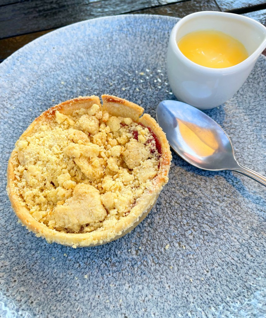We then treated ourselves to desserts. I’ve been craving custard for ages and nowhere seems to do it anymore. Probably as it’s more of a pain than ice cream or just cream. But I spotted an apple and blackberry crumble pie on the menu that came with custard, so even though it was a scorcher of a day, I ordered that whilst everyone else ordered ice cream. And you know what? It was flippin’ delicious…..