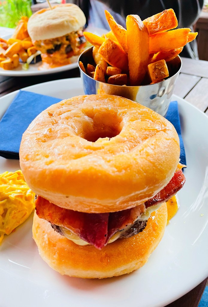 Now I’d already been told what I had to try from the menu, owing to the fact the foodie I mentioned earlier actually works at this pub. So I stuck to my guns and ordered the limited edition ‘Luther Burger’. This beauty consisted of 2 burgers topped with Swiss cheese, bacon and maple syrup, served between two glazed doughnuts. Yes it’s a doughnut burger, and oh em gee it was glorious. Sweet, unctuous and so so moreish. I devoured it without uttering a word.