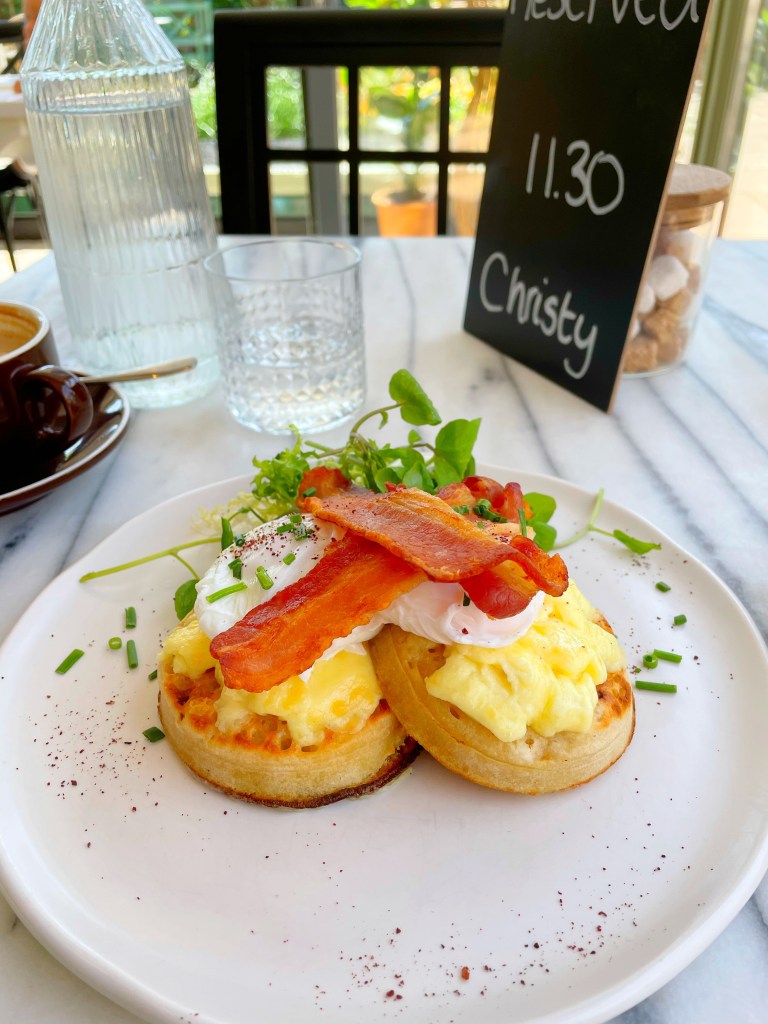 It was a scorcher of a day and I was absolutely melting, but I still ordered a coffee to start before scouring the brunch menu. I chose the ‘Sprout crumpets’ to eat. This was made up of two crumpets topped with streaky bacon, poached eggs, Cheshire Cheddar, chives and Wirral watercress. It was absolutely delicious and quite a large portion!