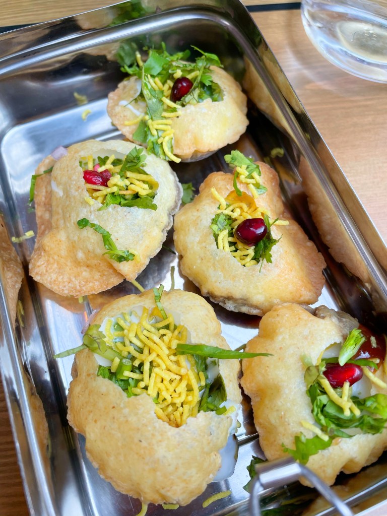 The food arrives as it’s ready and first to come was our Monkey Wrap. This open roti had massive pieces of tandoori chicken, pomegranate, spinach, mint and loads of fabulous chutneys on it and we ate it incredibly quickly. Which turned out to be great as everything else then turned up! People rave about Mowgli Yoghurt Chat Bombs, and though I’ve had them before I’d forgotten how fabulous they were. Crispy puff breads full of chickpeas, spiced yoghurt, tamarind and coriander that explode when you bite them. You eat them in one mouthful so just imagine a poppadom filled with all the toppings that you can eat in one. Joyous.