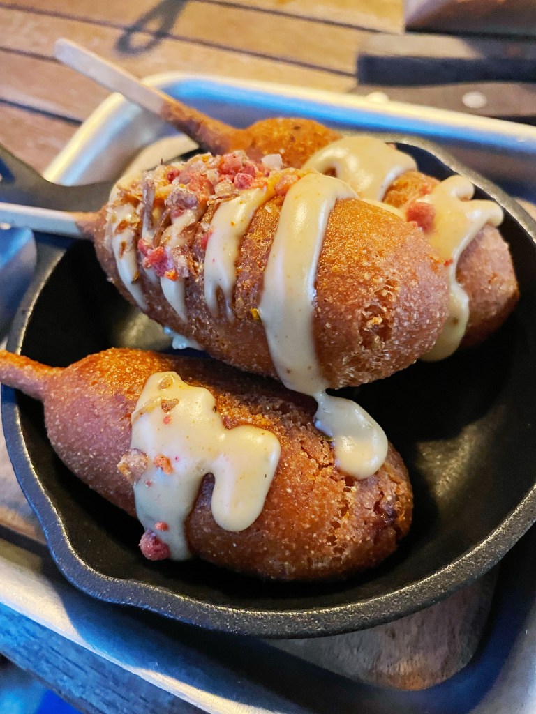 I chose corn dogs to start as I’ve never had them before. Three sausages are dipped and fried in a cornmeal batter, served with South Carolina barbecue sauce, a sprinkling of crispy shallots and bacon bits. And wow they were good. Steve chose a free from roast sweet potato and okra gumbo, a hot and spicy stew from Louisiana.