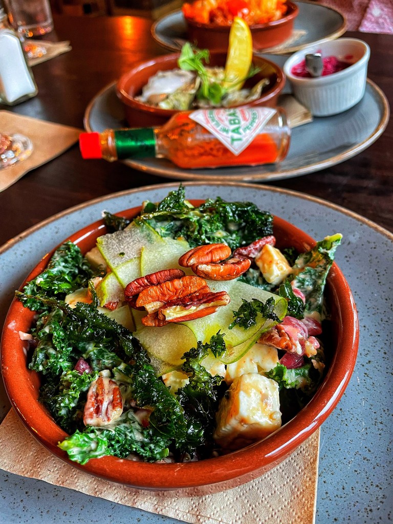 We began with an Oyster each, served with red wine vinegar and shallots. We did take photos of us eating them but wow they weren’t good 🤣 then to start I went for a Pomegranate, Pecan, Kale and Feta salad with a lemon tahini dressing. I didn’t expect to enjoy this as much as I did but it was lovely. Steve went for Pan fried prawns with garlic and chorizo and ate them so fast I barely got to see them. High praise indeed.
