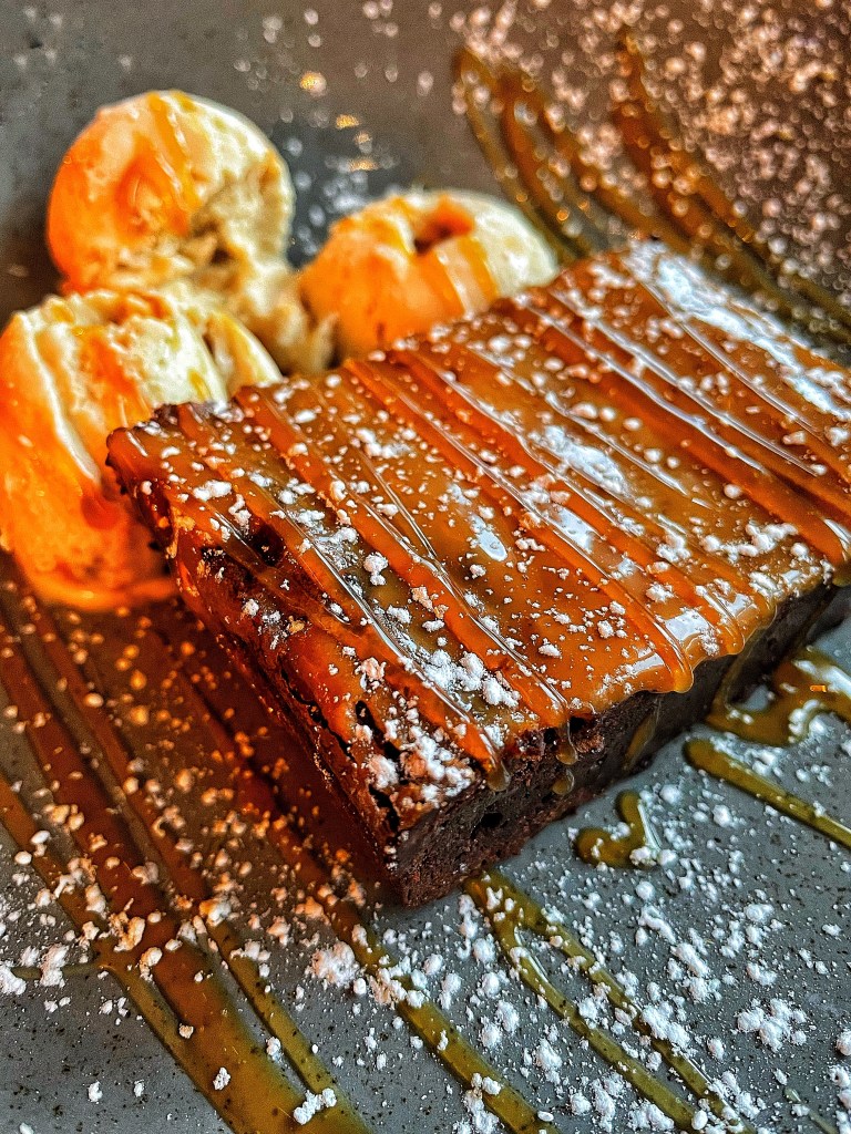 After eating these lovely pots of shellfish we were pretty full but I still asked for the dessert menu. I am a foodie after all. I wasn’t too fussed until I spotted a supplier of brownies that I recognised and have bought from before. So I went for the Torta Chester salted caramel chocolate brownie, with toffee sauce and salted caramel ice cream 😳