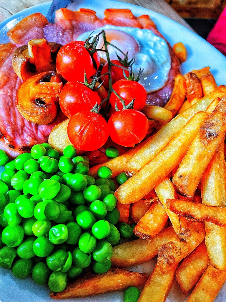 Wanting to celebrate but not being overly hungry we went straight to ordering main meals. Steve went for a 10oz gammon steak with an egg, mushrooms, grilled tomatoes, peas and chips. All gluten and dairy free and absolutely humongous! He polished the lot with some help from the dogs.