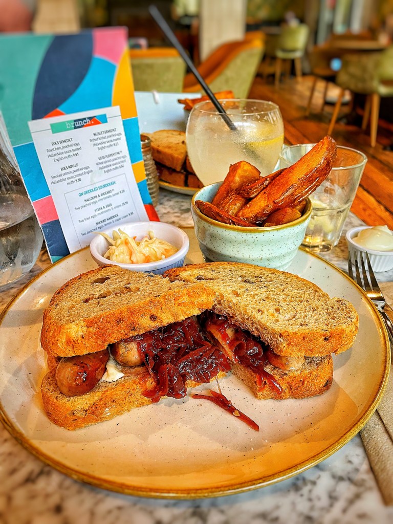 Now the main menu was pretty huge. Soup, sandwiches, burgers, wraps, pastas, pies the lot. The ladies I was with both chose the pork and leek sausage sandwich with wholegrain mustard mayonnaise and an onion confit from this menu..,,