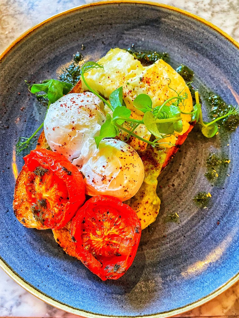 I chose from the separate little brunch menu and went for Halloumi and avocado on griddled sourdough, with two poached eggs, vine tomatoes and sumac…