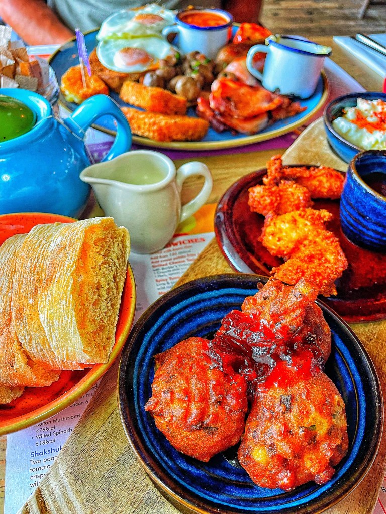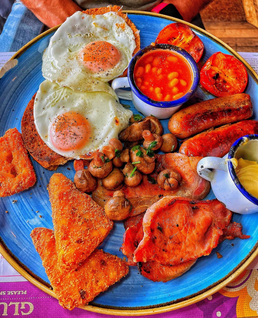 Today we sat, dogless and ordered lunch. Steve went for the gluten free Big Lounge Breakfast and when ordering easily switched out any butter for vegan butter and milk for oat milk. Plus, until now, we didn’t know gluten free hash browns were a thing!