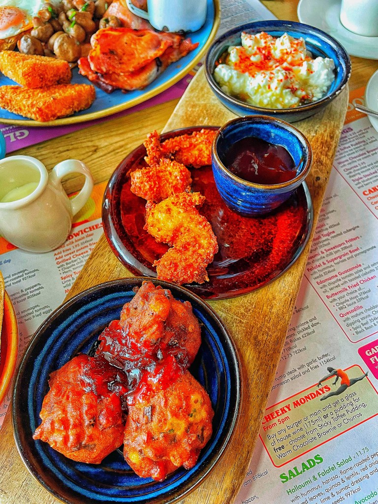 I went for a tapas board and could choose three items. I went for the Honey Whipped Feta, with Aleppo pepper, oil and ciabatta. This came highly recommended and was delicious. The Halloumi and sweetcorn fritters with chilli jam were beautiful and were spiced in such a way I felt like I was eating yummy Indian food. I also chose the buttermilk fried chicken with a BBQ dip which is just a classic flavour combination.