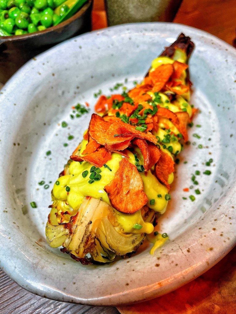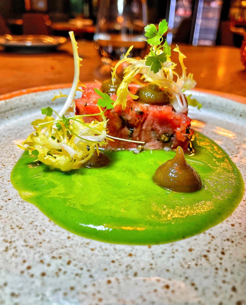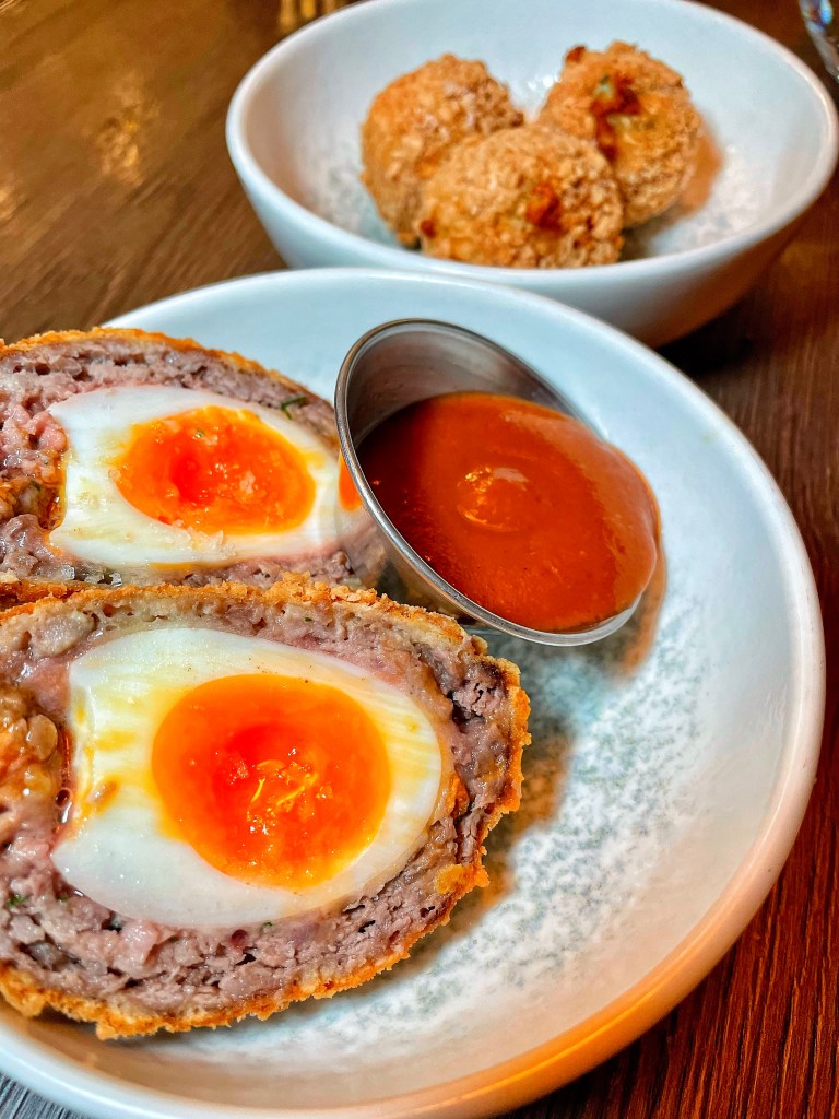 We began with the restaurants beautiful bread and butter and a few nibbles. A venison scotch egg for Steve, with homemade brown sauce. Isle of Mull Cheddar and onion croquettes with a mushroom ketchup for me. We immediately knew this was going to be a good meal as these were delicious. Steve ordered a starter of ham hock whereas I skipped this course knowing it’d fill me up. I spent the time watching the fabulous chefs at the flames.