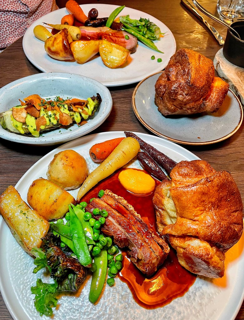Now onto the main course. With a choice of Roast Sirloin of Beef or Roasted Pork Belly , Steve went for the beef and I the pork. But we all know the best bit of a roast is the sides. Included was fluffy and crispy roast potatoes, seasonal veg, Yorkshire pudding and gravy. I’d also heard that a must have was the BBQ Hispi cabbage. Which luckily could be made gluten and dairy free for us to share.