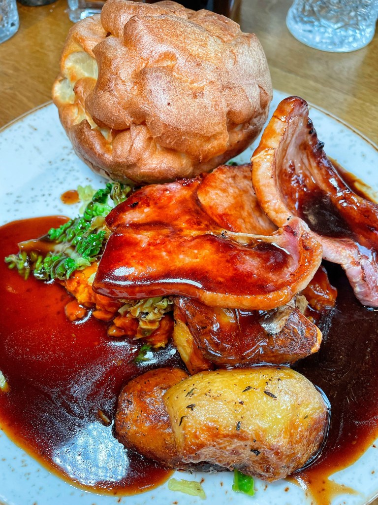 The roasts were lovely, though beef and bacon wouldn’t be my usual roast choices. The veggies were cooked well and I went for an extra Yorkshire pudding which was yum covered in gravy. Steve’s food intolerances we’re catered to easily and happily.