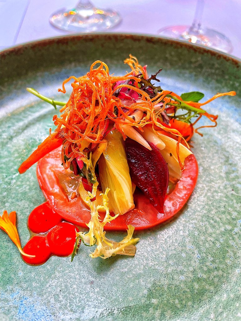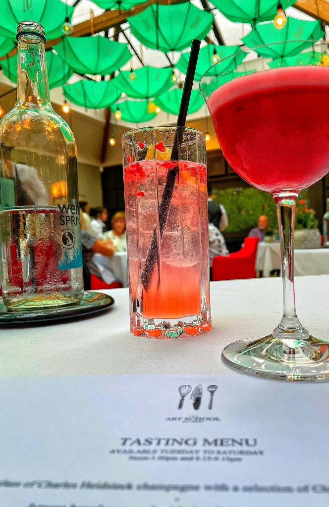 The interior was bright and airy, with skylights, contrasting red chairs and green umbrellas along the ceiling. Bad luck for some but I thought they were great fun. We had booked the tasting menu at £110 each (we always splash out on our anniversary) and were seated promptly by a very friendly waitress. Steve’s allergies were discussed and we ordered mocktails to enjoy with our Amuse Bouche.