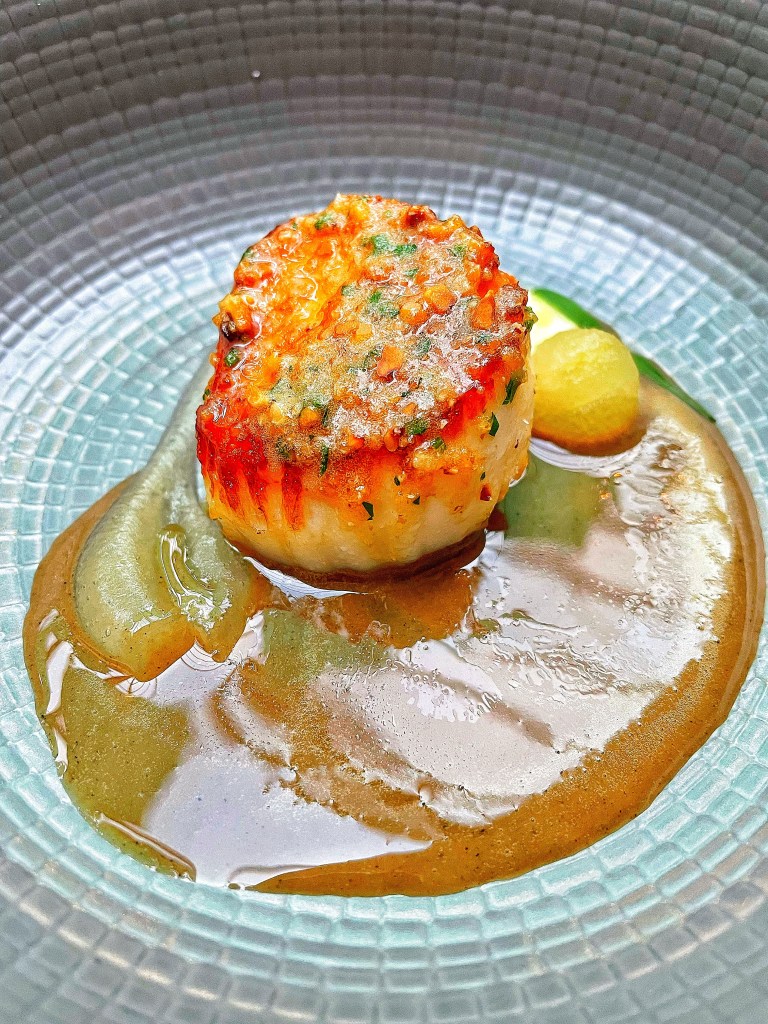 🍏Pan fried scallop with hazelnut crumb, soubise, apple gel and truffle jus