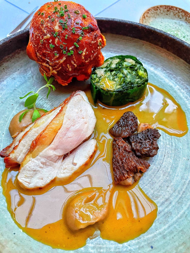 🍗Breast of guinea fowl served with confit leg & cabbage parcel “vadouvan” sauce with stuffed morel